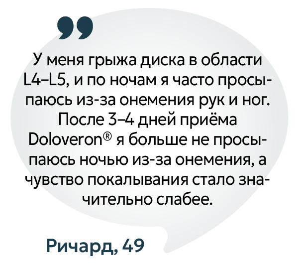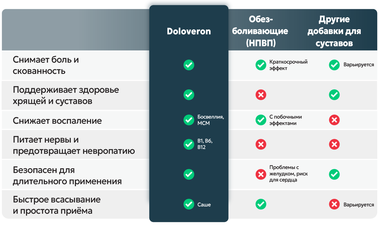 Когда речь идёт о подвижности и здоровье позвоночника, вы заслуживаете решения, которое действительно работает. Doloveron — это научно обоснованная формула, созданная для того, чтобы вы могли двигаться без ограничений. Благодаря мощному комплексу глюкозамина, хондроитина, МСМ и босвеллии, Doloveron активно поддерживает хрящевую ткань позвоночника, уменьшает дискомфорт и способствует долговременной прочности суставов. Витамины группы B (B1, B6, B12) поддерживают нормальное функционирование нервной системы, улучшают подвижность и уменьшают скованность, обеспечивая всесторонний уход за позвоночником и суставами изнутри.